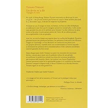 En 1976, à Hong Kong, Tiziano Terzani rencontre un devin qui le met en garde : «Ne prends surtout pas l'avion en 1993 !» Seize années plus tard, le 31 décembre 1992, il décide de respecter la prophétie. Pendant un an, il voyage en train, en bateau, en bus ou à dos d'éléphant, et redécouvre une Asie que le voyageur pressé ne connaît plus. Cette année sans prendre les airs est le prétexte pour brosser l'un des tableaux les plus riches et les plus vivants jamais peints de l'Asie, de sa culture propre, de sa spiritualité et de ses peuples. Avec lui, on suit la chasse aux esprits dans les ruelles de Bangkok, l'hystérie géomancienne des généraux birmans, les pelotons d'exécution des Khmers rouges au Cambodge, et l'on découvre un continent aux prises avec ses propres démons, écartelé entre une modernisation à travers laquelle se dessinent les prémices de la mondialisation et des cultures ancestrales souvent garantes du lien social. Dans chaque pays visité, Terzani va aussi à la rencontre de nouveaux devins, comme pour jouer avec le prétexte même de son périple et confronter la prédiction initiale aux dires de nouveaux prophètes, pas toujours très inspirés. Mais c'est surtout une façon d'approcher comme personne avant lui la spiritualité propre à ce continent si fascinant. Souvent comparé à Kapuscinski, à Bruce Chatwin ou à Nicolas Bouvier, Terzani signe ici un très grand livre. «Le voyage est l'art de la rencontre, et Terzani sait le pratiquer mieux que quiconque.» Philippe Pons, Le Monde «Un livre étrange, initiatique, qui démarre en tourbillon.» Florence Aubenas, Libération L'AUTEUR Né à Florence en 1938 Tiziano Terzani a été pendant près de trente ans le correspondant en Asie de plusieurs journaux européens, dont Der Spiegel et le Carrière délia Sera. Il a vécu à Singapour, Hong Kong, Beijing, Tokyo, Bangkok, Dehli et depuis sa mort, en 2004, son oeuvre connaît un succès fulgurant dans de nombreux pays. Légende du grand reportage, il a assisté, depuis la chute de Saigon, à tous les grands tournants de l'histoire à l'est de l'Europe, jusqu'à sa disparition, en 2004. Son oeuvre est devenue un véritable phénomène de société en Italie. Une adaptation cinématographique d'Un devin m'a dit est en cours.